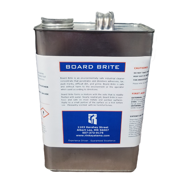 Board Brite Cleaner is an environmentally safe, non-toxic, industrial cleaner concentrate that penetrates and dissolves adhesives, tar, puck marks and difficult dirt and grime. Safe on most metals and painted surfaces. Apply a small portion to the surface as a test before use. Pleasantly scented with no harmful fumes and can be sprayed or brushed. Safe and without harm to the environment or the operator when used according to directions. Recommended for dasher boards only, not for use on tempered glass or acrylic.