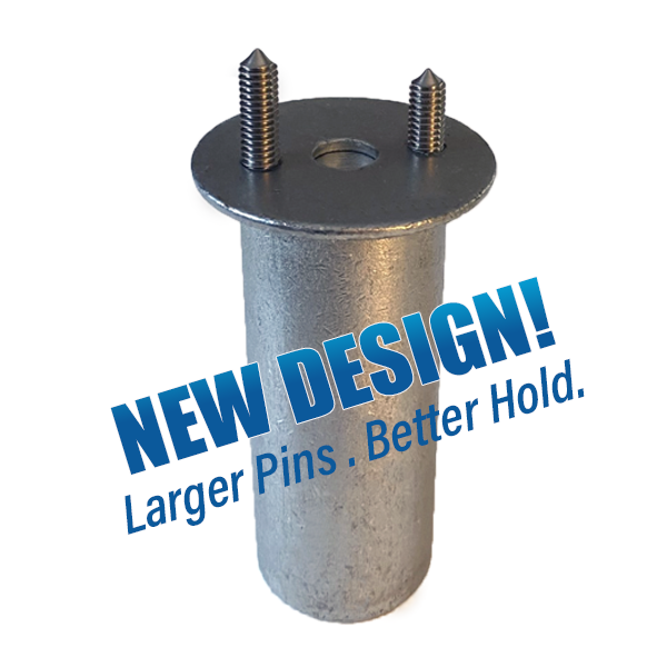 NEW DESIGN! NOW WITH LARGER PINS FOR A BETTER HOLD. Dual freeze in pegs are made with a strong, zinc plated, steel construction.  Pegs keep goals secure and in place and can be used in any indoor or outdoor ice rink. Easy installation and fits any goal size. Adjustable and replaceable pins.