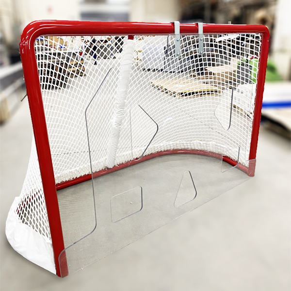 Give your players that clear line of vision and improve shooting accuracy with our new Stealth Shooter.  Constructed with 3/8″ polycarbonate and 2 galvanized steel hooks for a secure tight fit, it’s a strong and durable product for trainings and team practices. Fits a full size regulation goal frame. A Rink Systems Innovation!
